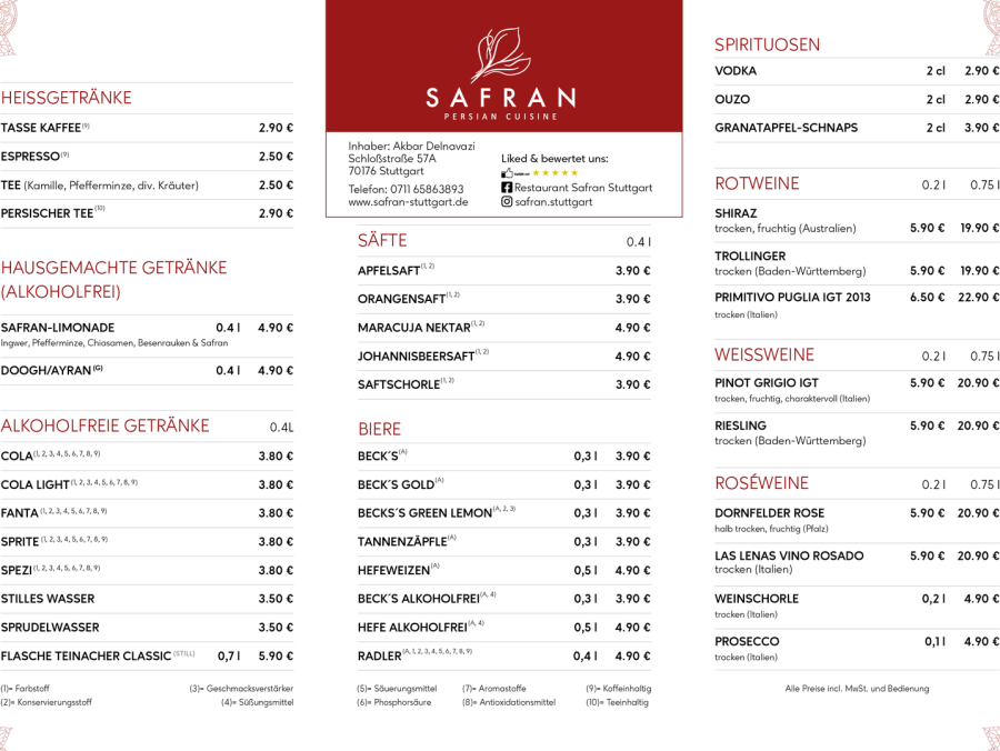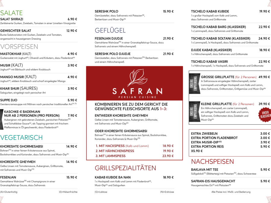 KHORESHTE GHORMESABSI MIT LAMMSPIESS | Bohnen (H) in einer feinen Kräutersauce aus Spinat, Bockshornklee, Koriander, dazu Safranreis & Musir-Dip (G)